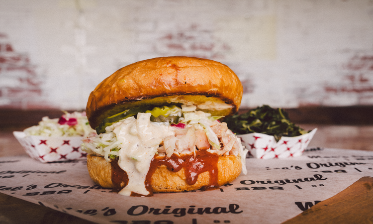 Slow smoked pork shoulder, dressed in a tangy sop sauce, served on a toasted bun, with our house made sweet and tangy BBQ sauce, cool and crisp marinated slaw, creamy Alabama style white BBQ sauce and pickles
