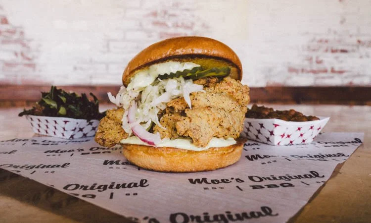 Hot, smoked chicken, pulled from the bone, served as a combination of white and dark meat on a toasted bun with with our house made sweet and tangy BBQ sauce, cool and crisp marinated slaw, creamy Alabama style white BBQ sauce and pickles